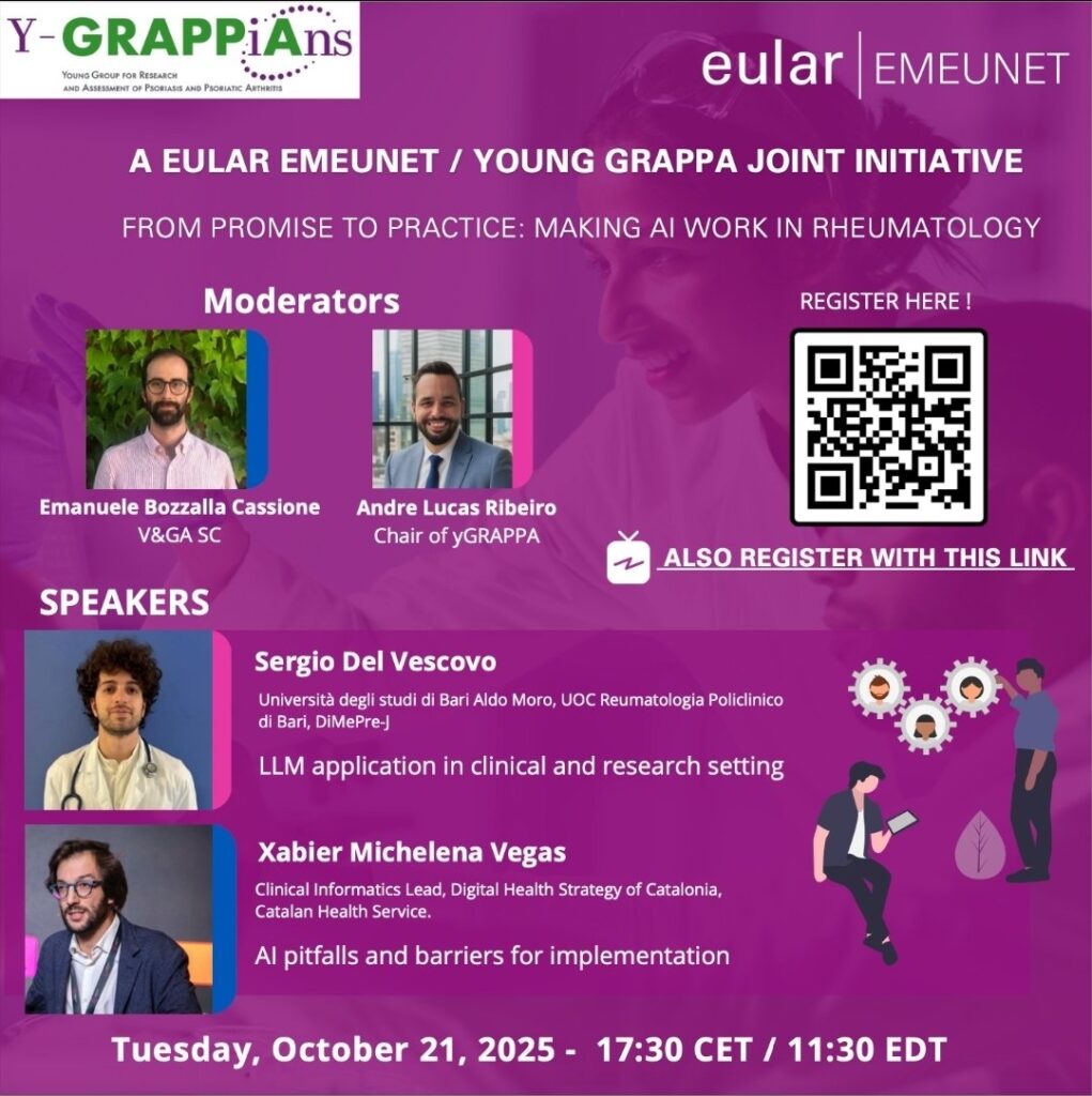 This joint Young-GRAPPA-EMEUNET webinar features the Practical use of AI in our daily life as a Rheumatologists, offering both clinical and research perspectives.